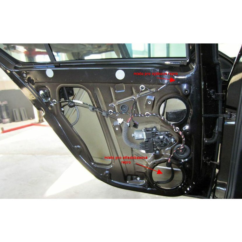 Výškové repro se umisťují do kliček dveří, širokopásmové repro do zadních dveří pod čalounění.